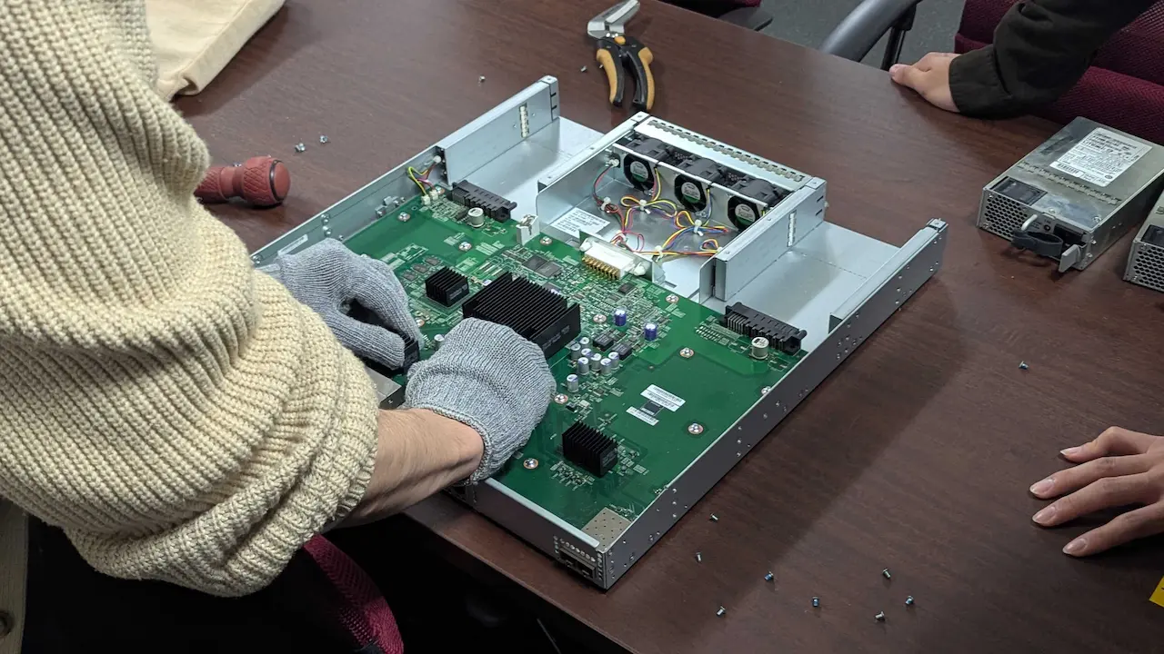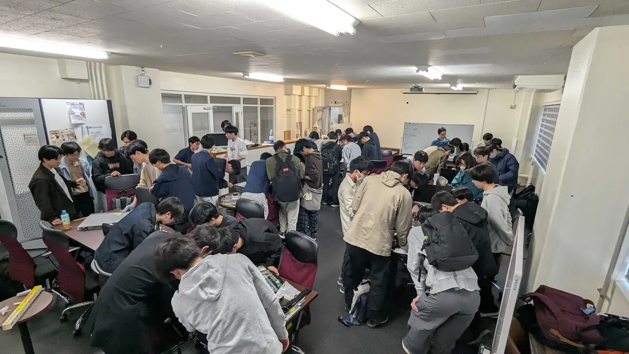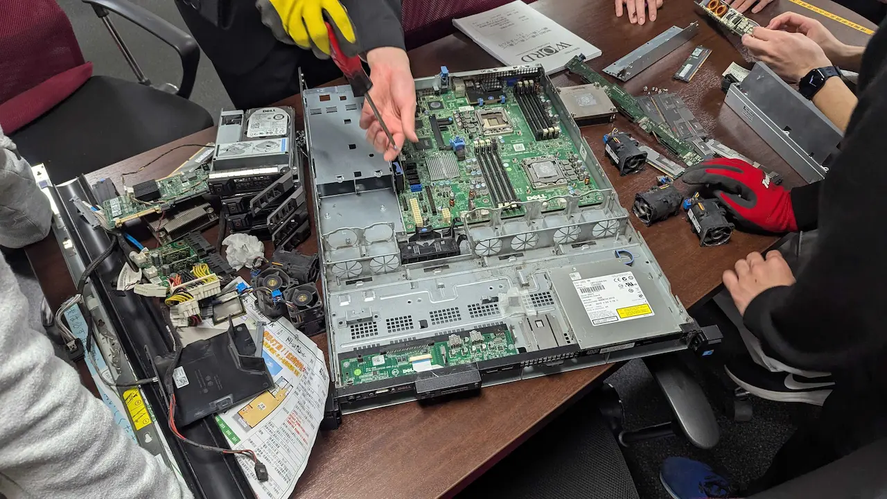 また、オリエンテーション終了後には、情報科学類ラウンジにてパソコン機器分解会を実施しました。 当日は、廃棄予定となったパソコンやサーバ機器、ネットワーク機器・GPU などを実際に分解し、内部構造や各部品の役割を確かめながら観察しました。 多くの新入生の皆さんにご参加いただき、会場は大変盛況でした。